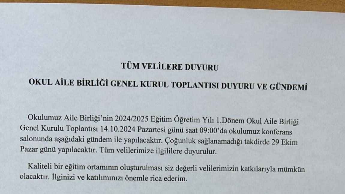 2024-2025 EĞİTİM ÖĞRETİM YILI OKUL AİLE BİRLİĞİ GENEL KURUL TOPLANTISI 14/10/2024 PAZARTESİ GÜNÜ SABAH 09:00 DA YAPILACAKTIR.
